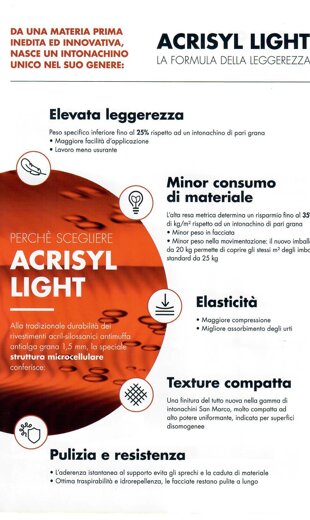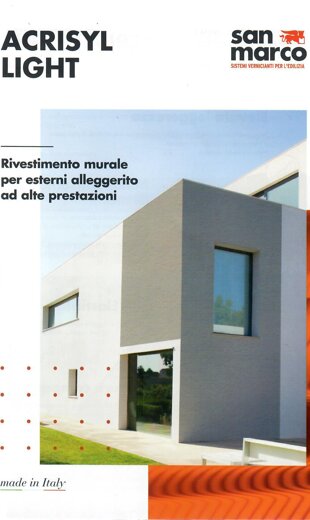 A base di legante acrilico. Buon potere riempitivo e mascherante delle imperfezioni. Alta resistenza agli agenti atmosferici ed ai supporti alcalini. Antimuffa e antialga.
